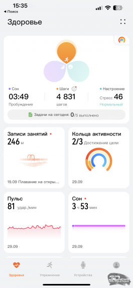 Claro, há uma grande variedade de modos de treinamento integrados – desde corrida ou caminhada até natação, que podem ser personalizados individualmente. O próprio relógio não pode determinar que você começou a treinar – você deve primeiro pesquisar na lista e selecionar. A lista de treinos ficou mais ampla – notei, por exemplo, a modalidade “Triatlo” para atletas sérios. Uma atualização muito importante: você não precisa mais interromper o treino para realizar outras tarefas no relógio.
