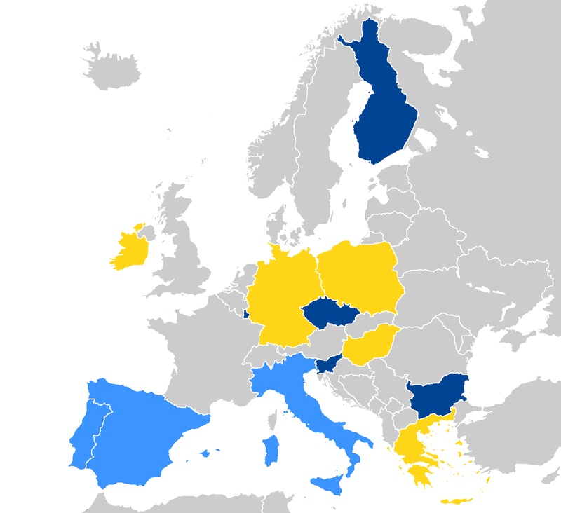 Os países que já lançaram sistemas EuroHPC estão marcados em azul escuro, azul claro estão em andamento, os recém-chegados estão marcados em amarelo. Fonte: EuroHPC