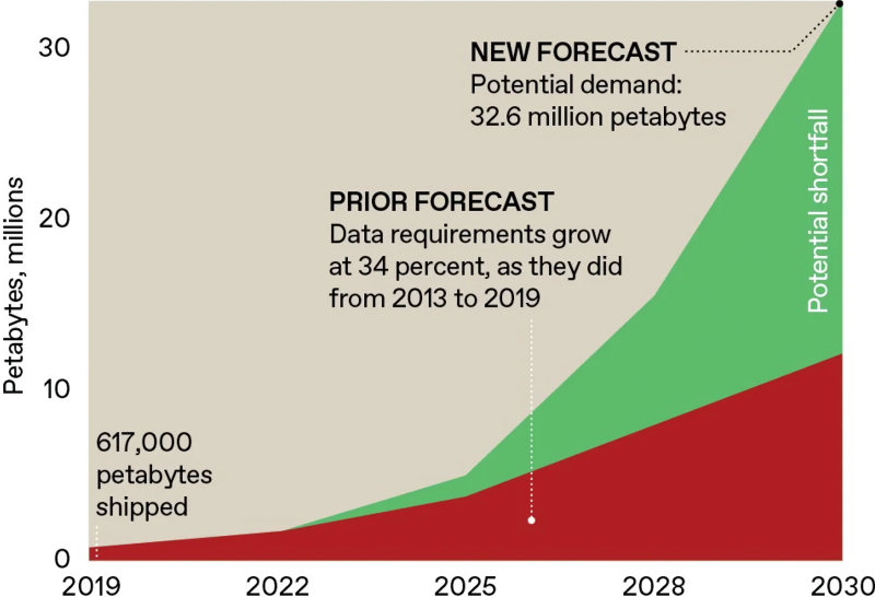 Em 2024, os analistas da Gartner revisaram suas previsões anteriores para o crescimento da demanda global por armazenamento de dados até 2030, em PB (área vermelha), reconhecendo que o desenvolvimento da IA generativa e outras tecnologias digitais adicionarão uma quantidade significativamente significativa de informações (área verde) às estimativas iniciais ano após ano — e até o final de 2025, essa estimativa provavelmente será revisada para cima novamente (fonte: Gartner)