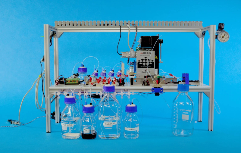 Como, de fato, é realizada a codificação primária de dados moleculares — a criação de fragmentos sintéticos básicos, que são então formatados nas extremidades por primers catalogados e usados para formar o DNA total final? Aqui, a química molecular vem ao resgate: nucleotídeos individuais são ligados entre si, formando uma cadeia polimérica, por meio de ligações fosfodiéster sequenciais, ao longo de uma série de etapas. Primeiro, dois monômeros (nucleotídeos individuais; digamos, A e G) são ligados — em um volume macroscópico, é claro; durante uma reação química com ativação do grupo fosfato, e não com pinças convencionais sob um microscópio igualmente convencional — então o próximo nucleotídeo necessário (digamos, C) é adicionado à solução do dímero resultante, obtendo-se assim um trímero, e assim por diante — até que toda a cadeia com a configuração necessária seja formada. No processo, é necessário monitorar cuidadosamente a homogeneidade dos produtos resultantes, introduzindo reagentes protetores para bloquear reações indesejadas. Atualmente, métodos mais avançados (rápidos, baratos e que proporcionam um alto nível de pureza do produto em cada etapa) utilizando a síntese de fosforamidita em fase sólida em sintetizadores automáticos são conhecidos, de modo que a criação de sequências curtas de nucleotídeos não pode mais ser considerada um problema sério. Em 2018, empresas como a GenScript Biotech e a Integrated DNA Technologies ofereciam a qualquer pessoa que desejasse o serviço de sintetizar fragmentos de DNA de fita dupla com até várias centenas de pares de bases por apenas 10 a 40 centavos por par; hoje, o preço é consideravelmente mais baixo.