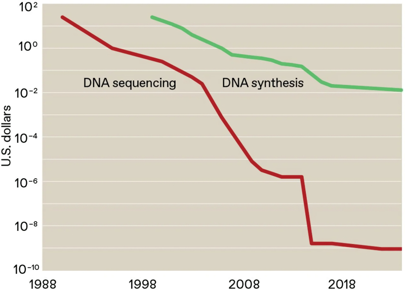 Ao longo de 35 anos, o custo do sequenciamento laboratorial de um único par de bases caiu de US$ 25 para menos de um milionésimo de dólar, mas a síntese continua muito cara para uma implementação verdadeiramente em grande escala de dispositivos de armazenamento de DNA (fonte: IEEE Spectrum)
