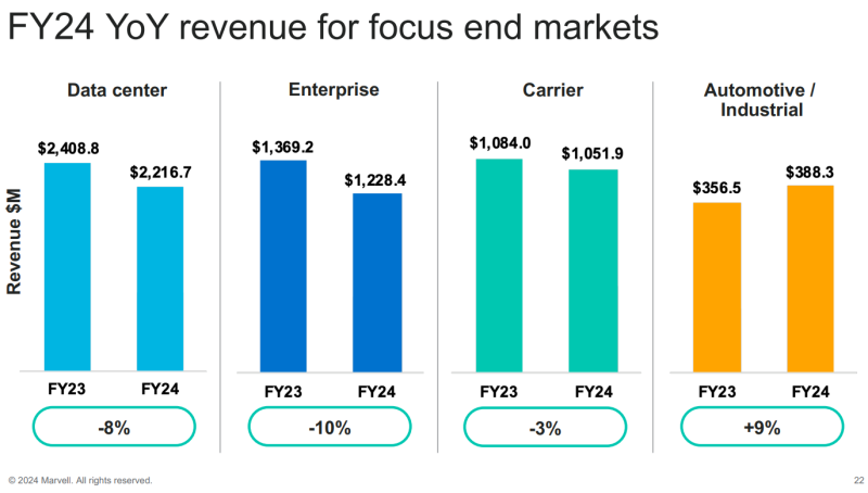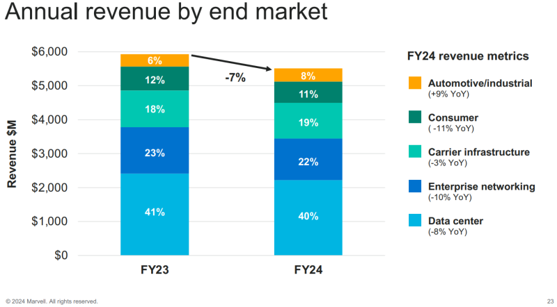 A receita líquida da empresa para o exercício financeiro de 2024 é de US$ 5,508 bilhões, o que é 7% menor que o resultado do ano passado. O prejuízo líquido (GAAP) do ano foi de US$ 933,4 milhões, ou 1,08 por ação diluída. O lucro líquido ajustado (não-GAAP) para o ano fiscal de 2024 é de US$ 1,310 bilhão, ou US$ 1,51 por ação diluída. Para o primeiro trimestre do ano fiscal de 2025, a Marvell prevê receita líquida de US$ 1,150 bilhão ±5%, com lucro diluído não-GAAP por ação de US$ 0,23±0,05, bem abaixo da previsão dos analistas de US$ 1,37 bilhão e US$ 0,40, respectivamente.