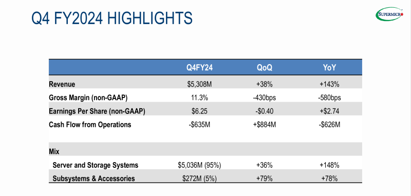 A Supermicro, fornecedora americana de servidores, sistemas de armazenamento e soluções integradas de TI, anunciou os resultados financeiros do quarto trimestre e de todo o ano fiscal de 2024, encerrado em 30 de junho de 2024. As ações da empresa caíram após o relatório, uma vez que os resultados trimestrais ficaram aquém das expectativas dos analistas.