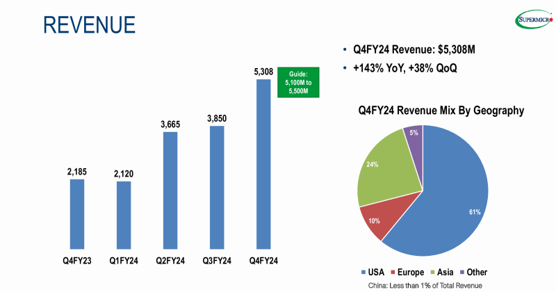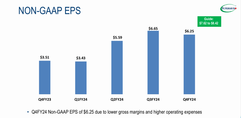 Quanto aos resultados do ano fiscal de 2024, a receita da Supermicro foi de US$ 14,94 bilhões, acima dos US$ 7,12 bilhões no ano fiscal de 2023. O lucro líquido foi de US$ 1,21 bilhão, ou US$ 20,09 por ação diluída, acima dos US$ 640 milhões ou US$ 11,43 por ação diluída no ano fiscal de 2023. O lucro líquido (não-GAAP) para o ano fiscal de 2024 foi de US$ 1,34 bilhão, ou US$ 22,09 por ação diluída, em comparação com US$ 673 milhões, ou US$ 11,81 por ação diluída, para o ano fiscal de 2023. A empresa espera receitas totais de US$ 26,0 bilhões a US$ 30,0 bilhões para o ano fiscal de 2025, que termina em 30 de junho de 2025.