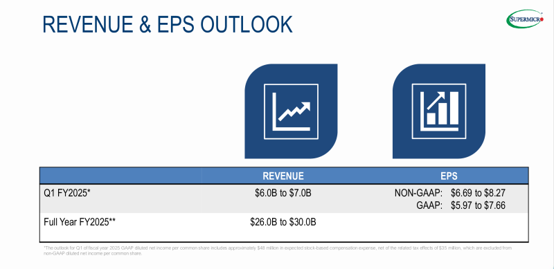 A previsão de receita da Supermicro para o primeiro trimestre fiscal de 2025 está na faixa de US$ 6 bilhões a US$ 7 bilhões, acima da previsão de Wall Street de US$ 5,46 bilhões. A empresa também espera lucro por ação na faixa de US$ 5,59 a US$ 8,27, ou a média é de US$ 7,48, enquanto os especialistas. estão prevendo US$ 7,58 em lucro por ação.