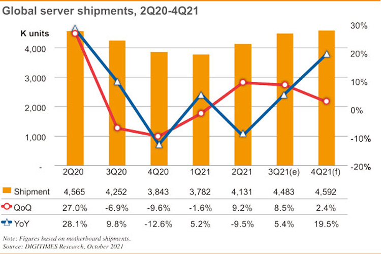 No terceiro trimestre deste ano, as remessas globais de servidores foram de aproximadamente 4,48 milhões de unidades. Isso representa um aumento de 8,5% em relação ao trimestre anterior e de 5,4% em relação ao ano anterior. No último trimestre deste ano, as entregas devem chegar a 4,59 milhões de unidades. Se essa projeção se justificar, o crescimento em relação ao terceiro trimestre do ano será de 2,4%. Na base anualizada, neste caso, os embarques crescerão 19,5%.