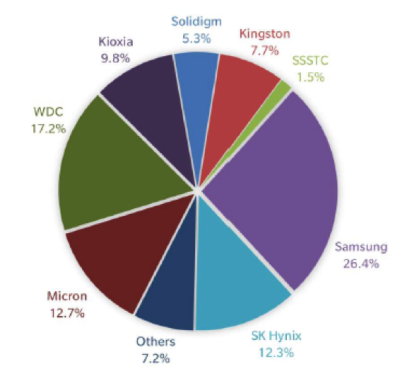 De acordo com a Trendfocus, os cinco principais players em termos de volumes de remessa em termos unitários e de capacidade de SSDs incluíram Samsung (26,4% e 31,1%, respectivamente), Western Digital (17,2% e 12,4%), Micron (12,7% e 13,0%) , SK Hynix (12,3% e 9,8%) e Kioxia (9,8% e 8,3%).
