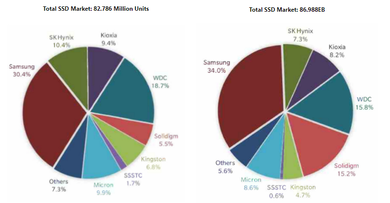 No ranking dos maiores players do mercado global, a Samsung lidera com uma participação de 30,4%. A segunda posição é ocupada pela Western Digital com 18,7%, e a SK hynix fecha os três primeiros com 10,4%. Em termos de capacidade total de armazenamento vendida, a Samsung controla 34,0% do mercado global de SSD. Em seguida vem Western Digital com 15,8% e Solidigm com 15,2%.