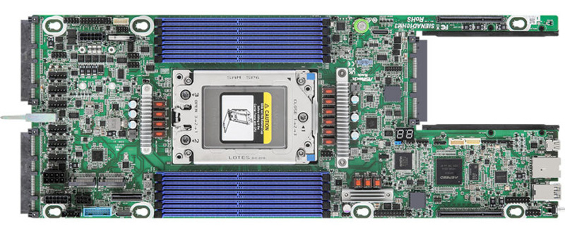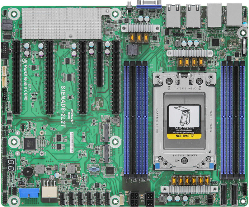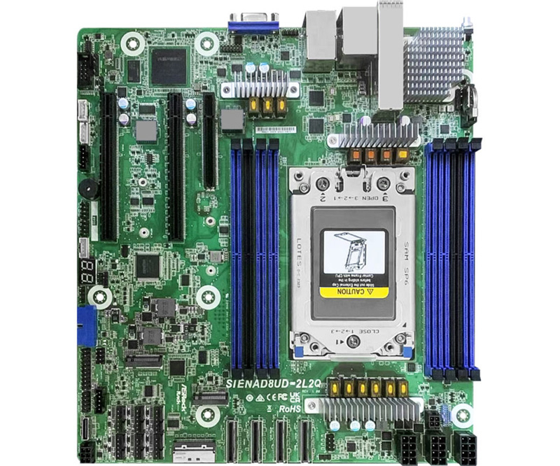 A placa SIENAD8UD-2L2Q, por sua vez, corresponde ao tamanho padrão Deep Micro-ATX. São oito slots DDR5-4800, dois slots PCIe5.0/CXL1.1 x16, um slot PCIe5.0/CXL1.1 x8, dois conectores M.2 22110/2280 (PCIe 5.0 x4), dois conectores MCIO (PCIe 5.0 x8 ou 8 × SATA-3), três conectores MCIO (PCIe 5.0 x8) e um conector OCuLink (PCIe 3.0 x4). Existem duas portas RJ45 de 1 GbE e SFP28 de 25 GbE, uma porta de gerenciamento de rede dedicada, duas portas USB 3.2 Gen1 Tipo A e um conector D-Sub.