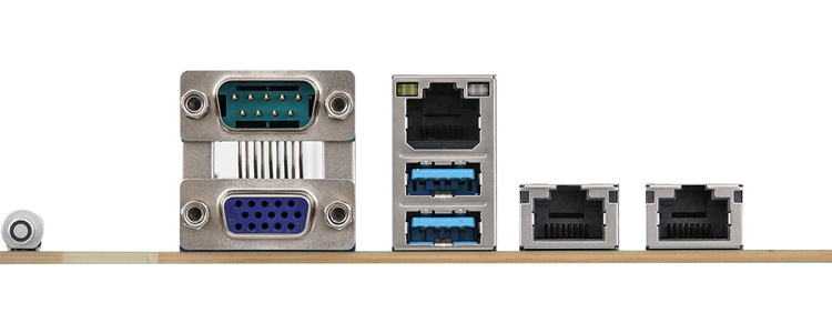 A placa-mãe recebeu duas portas de rede 10GbE e uma porta de gerenciamento de rede dedicada. A caixa de interface contém um conector D-Sub, dois conectores USB 3.2 Gen1 e uma porta serial.