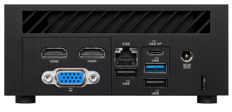 O conjunto de conectores inclui duas portas USB 3.2 Gen 2 Tipo C, três portas USB 3.2 Gen 2 Tipo A, dois conectores USB 2.0 Tipo A, duas interfaces HDMI, um conector RJ-45 e um conector de áudio de 3,5 mm. Além disso, está disponível uma porta configurável, para a qual são fornecidas opções HDMI, DisplayPort 1.4, D-Sub, 2,5 GbE RJ-45 ou RS-232 (serial). É possível exibir imagens simultaneamente em quatro monitores. As dimensões são 120x130x58 mm.