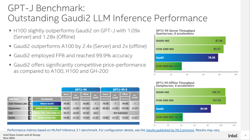 Em particular, no teste GPT-J, o acelerador H100 mostra uma vantagem de desempenho relativamente pequena sobre Gaudi2 – ×1,09 no modo servidor e ×1,28 no modo offline. Ao mesmo tempo, Gaudi2 supera o acelerador NVIDIA A100 em 2,4 vezes no modo servidor e 2 vezes no modo offline.