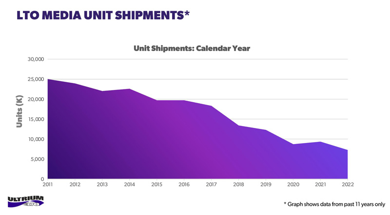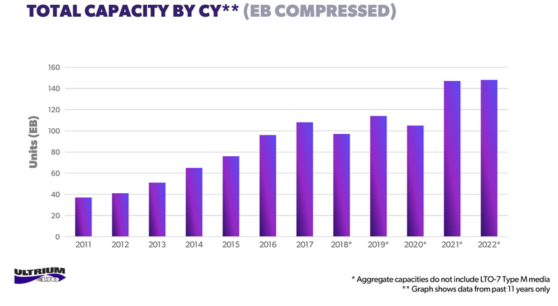 As LTO Program Technology Provider Companies (TPC) estimam que, em 2022, as remessas de cartuchos de fita LTO atingiram um recorde histórico em termos de capacidade total de armazenamento, com um total de 148,3 EB (43,8 EB não compactado). No entanto, o crescimento em relação ao ano anterior foi insignificante – apenas 0,5%.