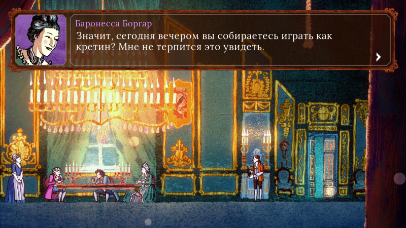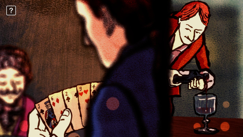Bem, em geral, o jogo acabou sendo atmosférico – o estilo visual parece simples apenas à primeira vista. Ruas da cidade, interiores de propriedades e cafés parlamentares – tudo parece muito bom. E os personagens parecem ser cortados de papel e animados de acordo. É muito agradável assistir ao Card Shark, e a música de câmara é adequada – dá vontade de passear pelos luxuosos salões dos antigos palácios.