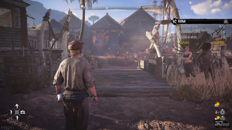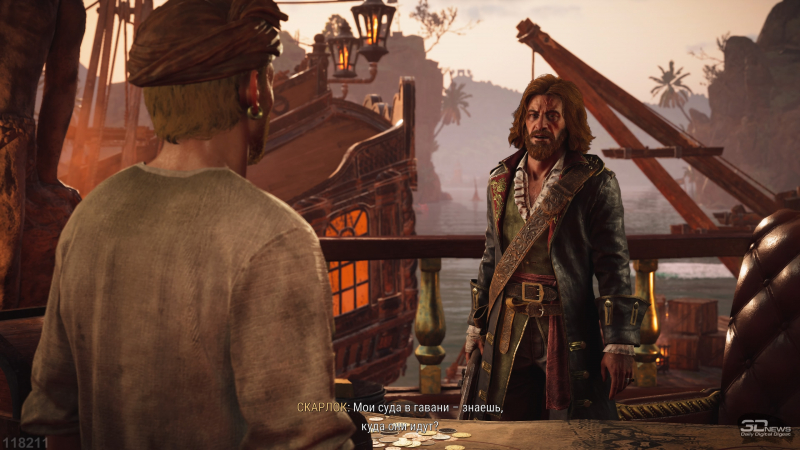 Além disso, há muitos itens cosméticos aqui: imagens na bandeira, páginas para colorir e decorações para a popa. É por isso que chamei o navio de personagem principal de Skull and Bones – espera-se que você se apegue ainda mais a ele do que a um cavalo em Red Dead Redemption 2. Você luta nele, move-se com sua ajuda (você não pode fazer uma transição rápida para outro local sem chegar ao cais), este também é o seu inventário. O pirata só corre até as pessoas com pontos de exclamação e assume tarefas, mas você só quer desperdiçar diálogos com outros personagens. Principalmente quando você percebe que escolher respostas nas conversas não leva a nada. Você poderia facilmente substituir o personagem por uma câmera voadora.