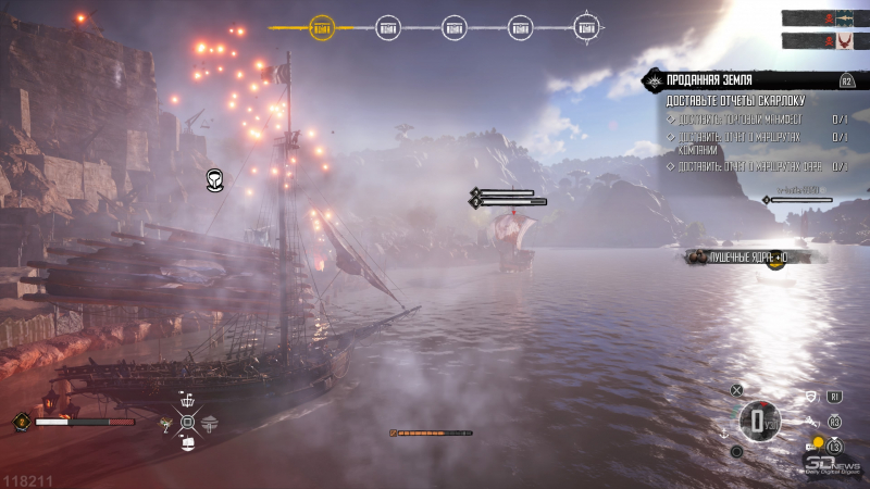 Mas isso é apenas o começo – o mais interessante começa quando você sobe de nível. Mais precisamente, na compra de equipamentos para o seu navio. Bombardas, canhões longos, barris de pólvora, morteiros – você escolhe o que e onde colocar, levando em consideração os bônus oferecidos. Os canos, por exemplo, aumentam o dano das armas do lado esquerdo, e as balistas aumentam o dano elemental. Se você comprar pedras de amolar, os projéteis voarão mais rápido e os armazéns e fornalhas aumentarão o raio de dano e o alcance máximo. Com uma forja de reparo, o navio começará a restaurar a resistência do casco em caso de avaria, e com um depósito de cachaça, a restauração da resistência será acelerada – é necessário aumentar temporariamente a velocidade do navio durante os movimentos e batalhas.