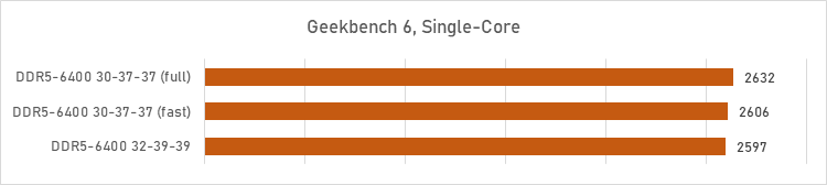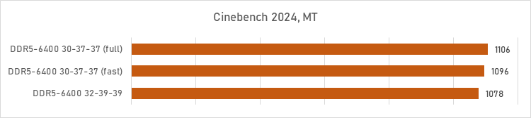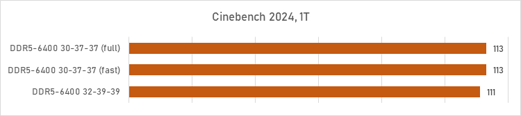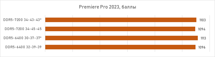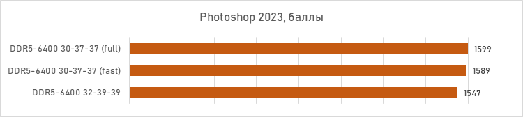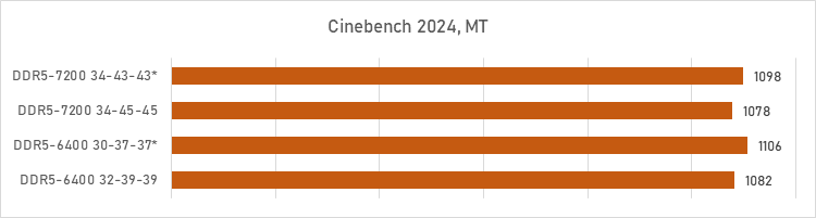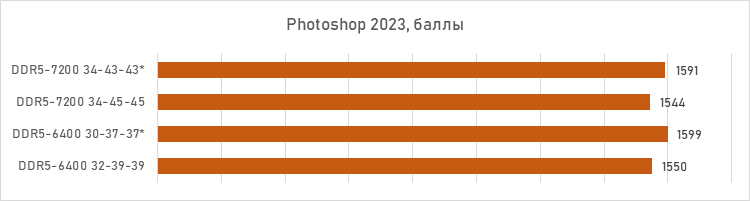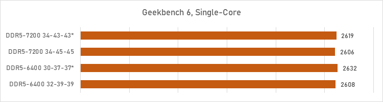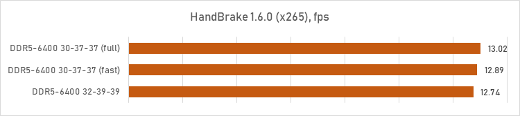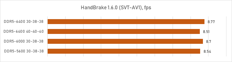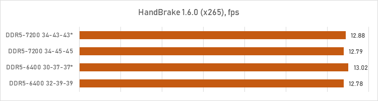 Com tais introduções, o DDR5-7200 não pode vencer em nenhuma circunstância. E é exatamente isso que vemos nos testes de desempenho de aplicações. Um sistema baseado em Ryzen 7 7800X3D com DDR5-6400 funciona mais rápido tanto ao usar temporizações automáticas quanto após ajustá-las. No entanto, a perda de DDR5-7200 não é tão dramática – seu valor é de 1,0-1,5%.