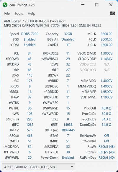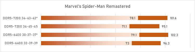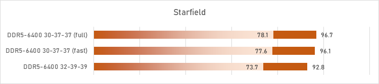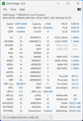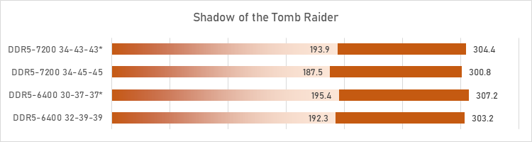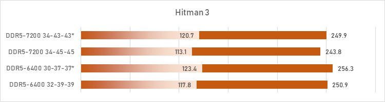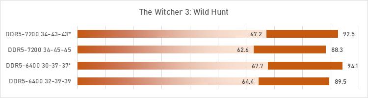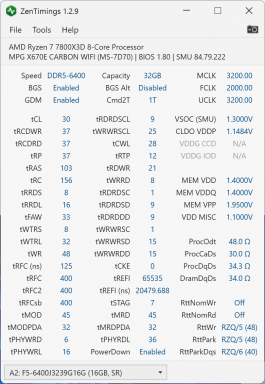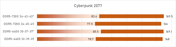 Esta se tornou uma ocasião para verificar se a memória de alta velocidade em um sistema baseado no Ryzen 7 7800X3D realmente reduz o desempenho. Para os testes, escolhemos o modo DDR5-7200, no qual utilizamos dois conjuntos diferentes de temporizações. Em primeiro lugar, o esquema padrão (para módulos de memória em chips SK Hynix) 34-45-45-115. Em segundo lugar, um esquema de temporização 34-43-43-55 otimizado, no qual todos os tempos menores foram cuidadosamente selecionados à mão para maximizar o desempenho.