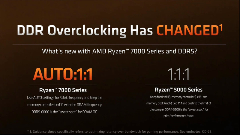 No Ryzen 7000, a situação mudou: esses processadores agora contam com um controlador DDR5, memória que opera em uma frequência significativamente maior em comparação ao DDR4. Portanto, o clock síncrono do Infinity Fabric com DDR5 tornou-se impossível desde o início. Devido à transição para processos tecnológicos mais modernos, a AMD conseguiu aumentar o teto de frequência deste barramento, mas de forma bastante modesta – a velocidade máxima do Infinity Fabric, que é alcançável em cópias particularmente bem-sucedidas do Ryzen 7000, não excede 2133-2166 MHz, e o máximo típico de suas capacidades é considerado uma frequência de 2.000 MHz. É por isso que para os novos processadores a AMD reescreveu as recomendações de configuração de frequências e agora fala exclusivamente sobre os benefícios da mesma frequência do controlador de memória e dos módulos DDR5, aconselhando que a configuração de frequência do Infinity Fabric seja transferida para os ombros da placa-mãe.