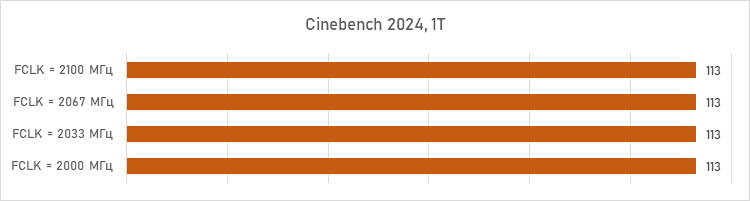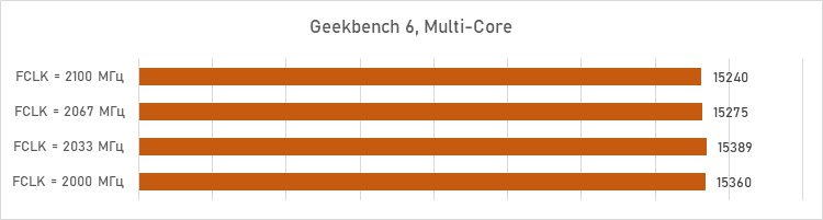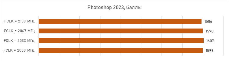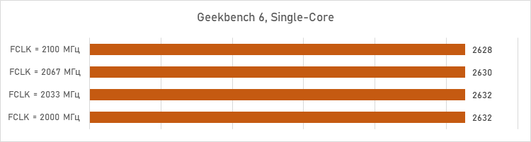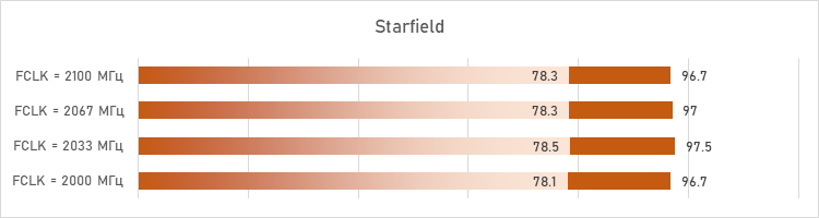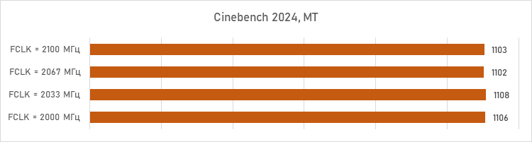 Por exemplo, nossa cópia do Ryzen 7 7800X3D funcionou de forma estável na frequência do Infinity Fabric até 2.133 MHz inclusive, mas em algumas aplicações já na frequência de 2.067 MHz foi possível observar não um aumento, mas uma diminuição no desempenho. Em outras palavras, o overclock confiável do Infinity Fabric acabou sendo possível apenas até 2.033 MHz, e um aumento adicional em sua frequência não aumentou o desempenho em todos os lugares, mas apenas em testes sintéticos e em aplicações onde não havia carga séria em backbone de memória do processador.