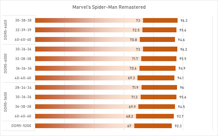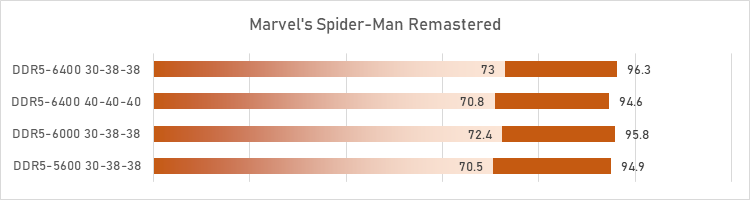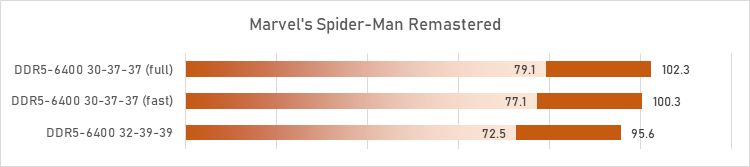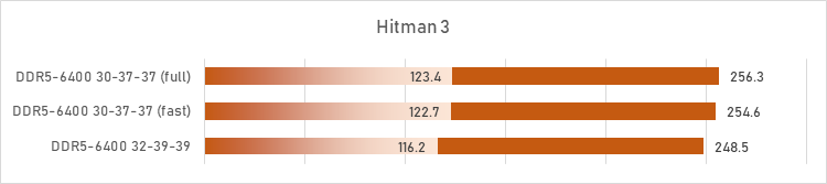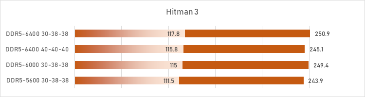 Aproximadamente a mesma situação pode ser observada nos jogos. DDR5-6400, trabalhando com o controlador de memória no modo 1:1, permite obter taxas de quadros 1-2% mais altas. Assim, a AMD diz que a memória de alta velocidade é desnecessária para o Ryzen 7000 – isso é confirmado pelos nossos testes.