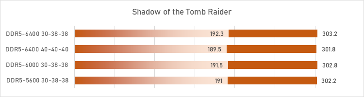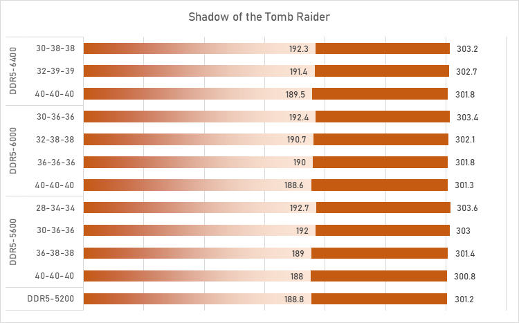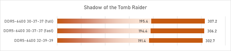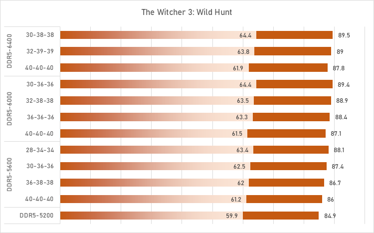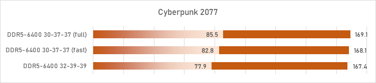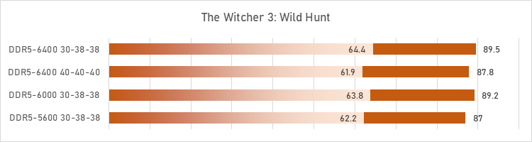 As conclusões tiradas podem ser ilustradas pelos resultados de testes em jogos, que estão entre as tarefas que dependem das características de velocidade do subsistema de memória. No entanto, todas as quatro opções de memória testadas fornecem aproximadamente o mesmo nível de FPS. A vantagem do DDR5-6000 sobre o DDR5-5600 é de apenas 1-2%. E mesmo a transição de DDR5-5600 para DDR5-6400, mantendo o mesmo esquema de latência, resulta em apenas um ligeiro aumento na taxa de quadros média no nível de 2-3%. Além disso, DDR5-6400 com tempos de 40-40-40-76 novamente não pode se orgulhar de superioridade sobre DDR5-5600 com tempos de 30-38-38-96 – essas variantes de kits de memória fornecem desempenho aproximadamente igual.