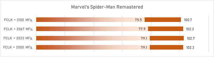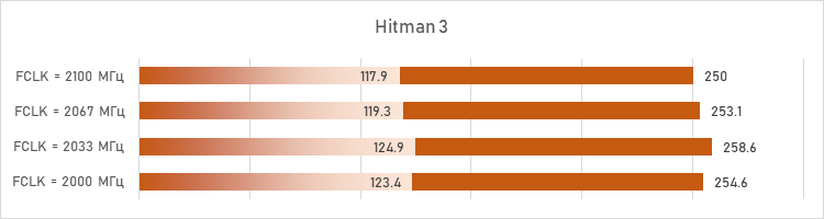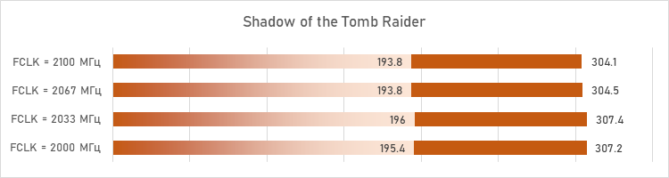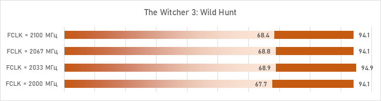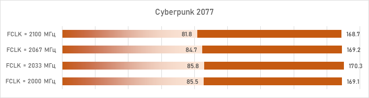 Com os jogos a situação parece mais certa. Aumentar a frequência do Infinity Fabric de 2.000 para 2.033 MHz aumenta o FPS médio em cerca de 1% e, à primeira vista, não há jogos em que tal overclock leve a um resultado negativo. No entanto, aumentar ainda mais essa frequência não parece mais uma boa ideia – tanto o FPS médio quanto o mínimo caem em alguns lugares ao passar para 2.066 MHz.