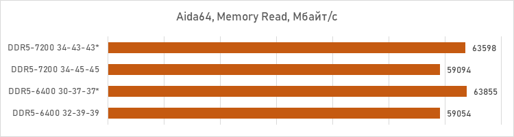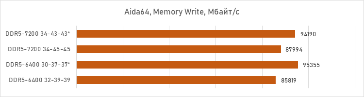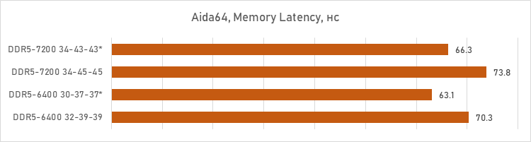 Como resultado, no benchmark Aida64 Cachemem, que mede o desempenho de velocidade real do subsistema de memória, DDR5-7200 e DDR5-6400 fornecem rendimento semelhante, apesar da diferença de 13% na frequência, e do ponto de vista da latência prática, mais rápido a memória perde.