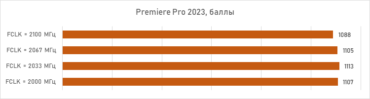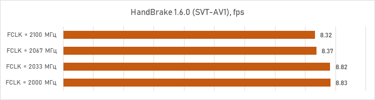 No entanto, os resultados dos testes nas aplicações não proporcionam motivos para um otimismo desenfreado. Em muitos casos, aumentar a frequência do Infinity Fabric funciona apenas em uma etapa – até 2.033 MHz. Um aumento adicional nesta frequência não leva a uma melhoria no desempenho devido ao overclock, o que acarreta um aumento no número de erros durante a transferência de dados. Além disso, há aplicações onde os primeiros problemas começam a surgir já na frequência de 2.033 MHz – estamos falando de transcodificação de vídeo. Portanto, por mais tentadora que possa parecer a ideia de overclock do Infinity Fabric, ela não é adequada para sistemas de produção utilizados na criação e processamento de conteúdo digital devido aos resultados imprevisíveis.