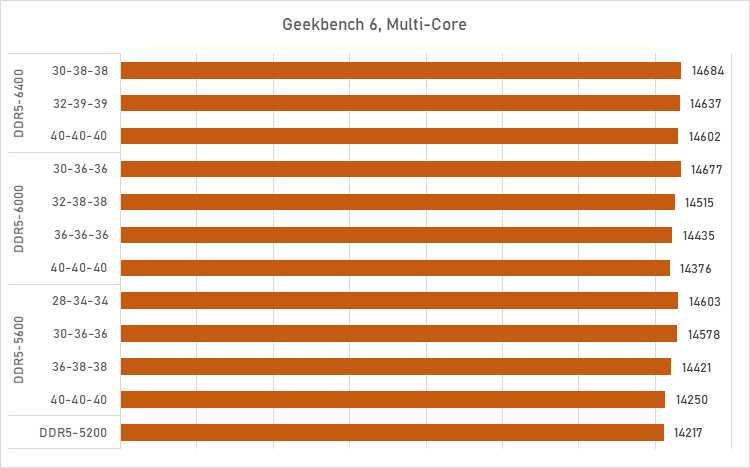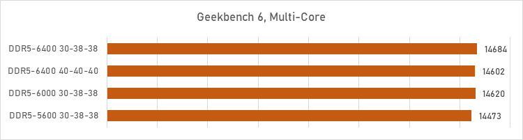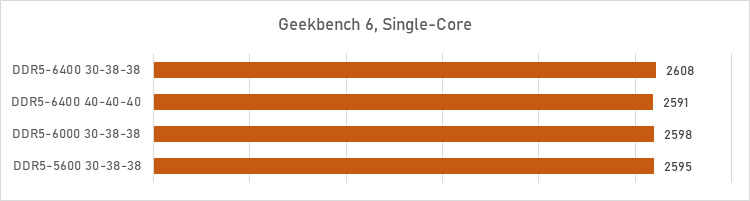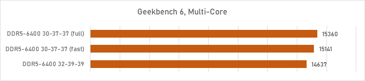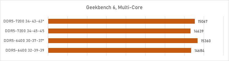 Comparamos o sistema equipado com DDR5-7200 com o mesmo sistema, mas trabalhando com DDR5-6400 usando temporizações “padrão” 30-38-38-96, bem como temporizações otimizadas manualmente, conforme descrito na seção anterior.