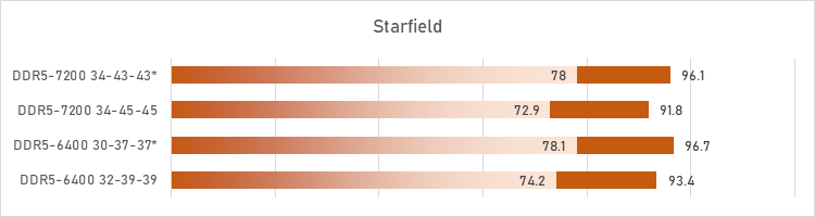 No entanto, devemos imediatamente fazer uma reserva de que é bastante estranho esperar do DDR5-7200 algum impulso adicional para melhorar o desempenho do Ryzen 7 7800X3D. Como já ficou claro, o desempenho da série Ryzen 7000 praticamente não aumenta com o aumento da frequência DDR5 devido às limitações internas da arquitetura, e a latência é de primordial importância. E ao ultrapassar o limite de 6.400 MHz de memória, eles realmente aumentam, já que o controlador perde a capacidade de trabalhar com módulos DDR5 SDRAM em uma única frequência.