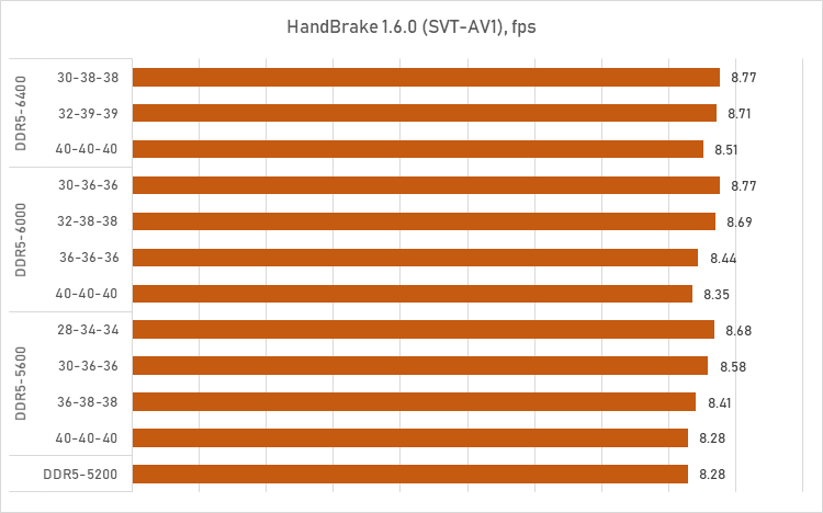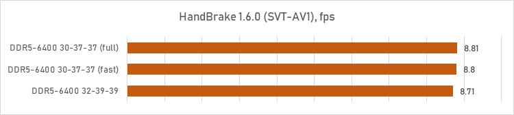 • Handbrake 1.6.1 – testando a velocidade de transcodificação de vídeo AVC 2160p@24FPS com uma taxa de bits de cerca de 42 Mbps para formatos mais avançados. Os codificadores de software x265 e AV1 (SVT) são usados.