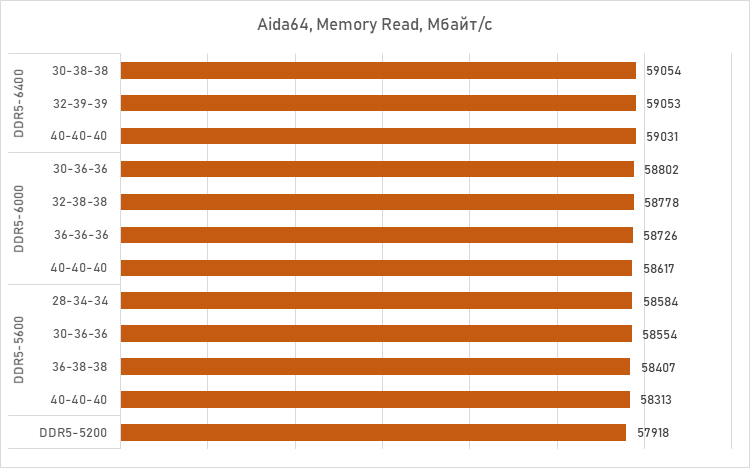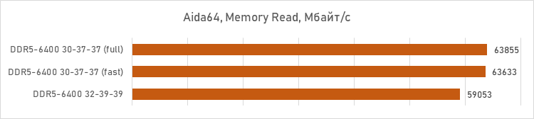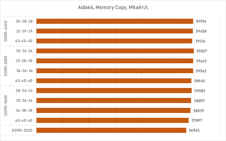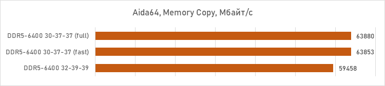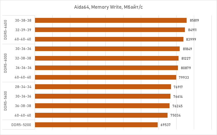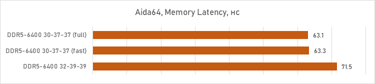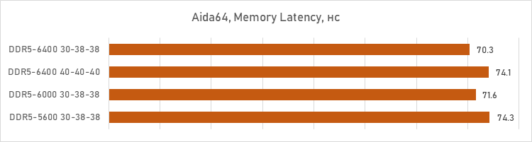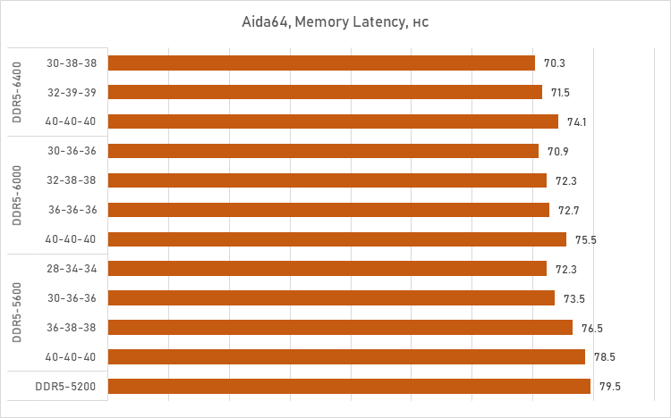 Os resultados da medição do rendimento e da latência no Aida64 Cachemem não surpreendem agora. Eles confirmam claramente tudo o que foi descoberto anteriormente – qualquer tipo de SDRAM DDR5 na plataforma Socket AM5 mostra quase a mesma velocidade de leitura e cópia, independentemente de sua frequência. Apenas a velocidade de gravação é dimensionada – com tal atividade, o DDR5-6400 está 20-25% à frente do DDR5-5200 básico.
