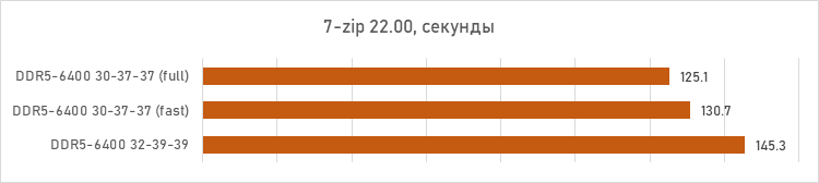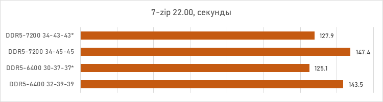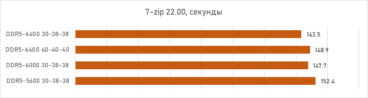 A fraca dependência do desempenho real do Ryzen 7 7800X3D na frequência da memória é claramente visível nas aplicações. Um passo de 400 MHz na frequência DDR5 com um esquema de atraso constante proporciona um aumento de desempenho de 1-2%. E mesmo em um arquivador que é muito sensível ao desempenho do subsistema de memória, o DDR5-6400 oferece apenas 6% de vantagem sobre o DDR5-5600. Ao mesmo tempo, a influência dos tempos é muito mais significativa – um sistema com DDR5-5600 CL30 não é inferior em desempenho médio a um sistema com DDR5-6400 CL40 difundido no mercado. E isso significa que a recomendação de escolher qualquer DDR5 com frequência de 6000-6400 MHz para sistemas Socket AM5 é no mínimo incorreta.