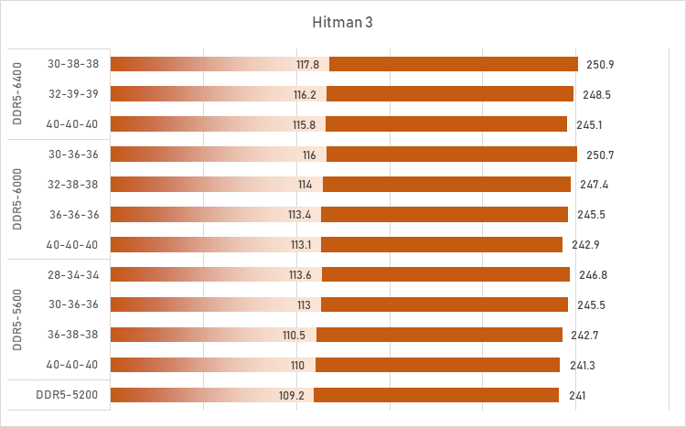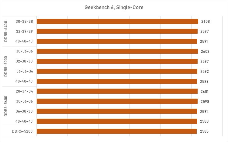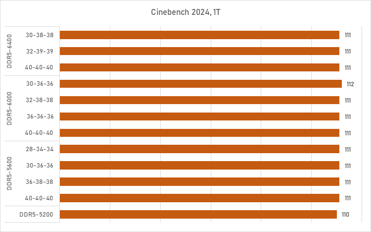 Quanto à latência prática, seus valores relativos estão distribuídos de acordo com a tabela acima. Por exemplo, DDR5-5600 CL30 supera DDR5-6400 CL40 e DDR5-6000 CL30 tem desempenho um pouco melhor que DDR5-6400 CL32.