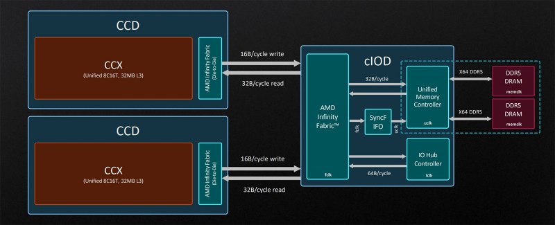 Ao mesmo tempo, o modo de memória síncrona no Ryzen 7000, estritamente falando, não é assim devido à operação do barramento Infinity Fabric em sua própria frequência independente. Na plataforma Socket AM5, essa frequência é de 2.000 MHz, independente da escolha do modo de velocidade da memória. Assim, os sistemas baseados em Ryzen 7000 perderam a sincronização completa de ponta a ponta ao enviar dados ao longo do barramento de memória do processador. Comentando esta discrepância, a AMD refere-se ao buffer aprimorado do Infinity Fabric, graças ao qual supostamente conseguiu minimizar as perdas de desempenho, e sugere que os usuários nem pensem na frequência desse barramento intraprocessador.