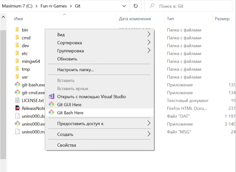 Após a conclusão da instalação no Windows Explorer, abra a pasta em que o Git foi instalado, e mantendo o cursor do mouse dentro desta janela (não importa qual arquivo), clique com o botão direito. Será aberto um menu no qual – devido ao fato de as opções “Git Bash Here” e “Git GUI Here” terem sido marcadas durante a instalação – duas novas linhas correspondentes aparecerão. Você precisa passar o mouse sobre “Git Bash Here” e pressionar o botão esquerdo do mouse para iniciar o mesmo terminal Mini-TTY que acabamos de discutir.