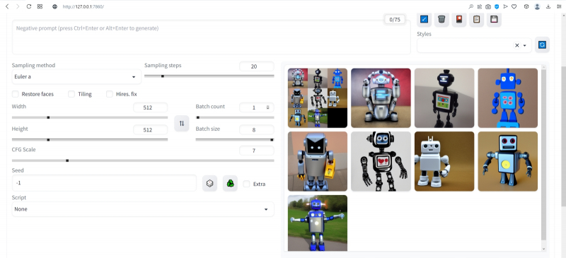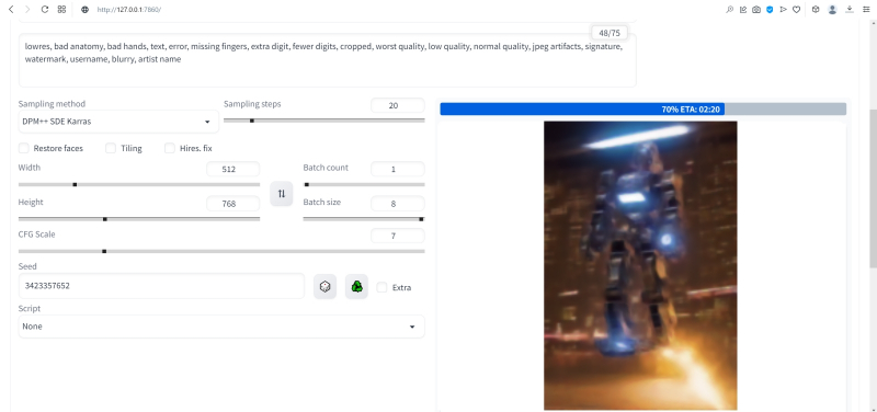 Vamos deixar o campo Negative prompt vazio, não vamos mexer em outros parâmetros, basta mover o controle deslizante Batch size (tamanho do pacote) para a direita até parar – para receber oito imagens com sementes diferentes de uma só vez: será mais fácil escolher um peça digna de processamento adicional. Em seguida, você deve clicar no enorme botão laranja Gerar – e, se tudo foi feito corretamente, depois de um tempo a difusão estável renderizará a dica recebida.