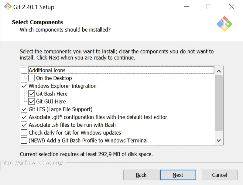 Na janela “Selecionar componentes”, você precisará certificar-se de que a opção de integração com o “Windows Explorer” esteja ativa, bem como duas opções em nenhum nível – “Git Bash Here” e “Git GUI Here”. O penúltimo será extremamente útil apenas para carregamento rápido e conveniente de um projeto do Git, que permite iniciar uma interface gráfica para interagir com o Stable Diffusion.