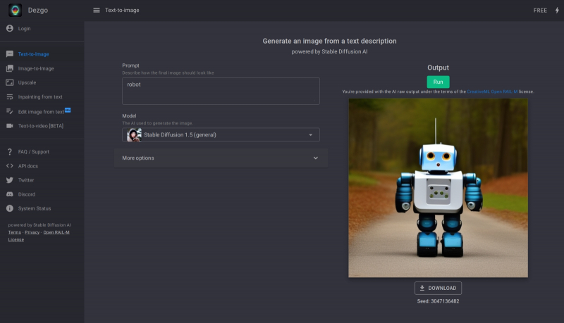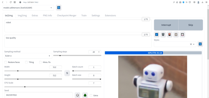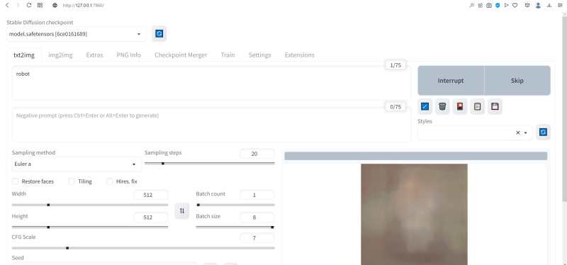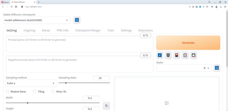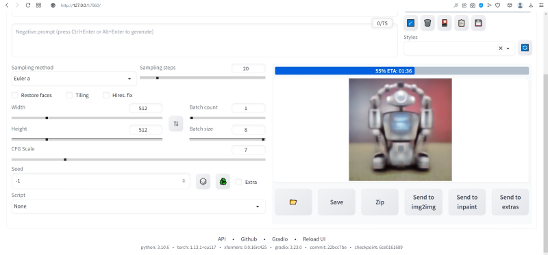 A interface está instalada, o usuário está na frente do computador – é hora de baixar o próprio Stable Diffusion, ou seja, um modelo baseado em aprendizado de máquina para converter texto em imagem gráfica (modelo text-to-image), escrito em Python . Ele recebeu acesso gratuito pela primeira vez em 22 de agosto de 2022 por seu próprio desenvolvedor, Stability.ai, uma empresa especializada no desenvolvimento de IA generativa de código aberto.