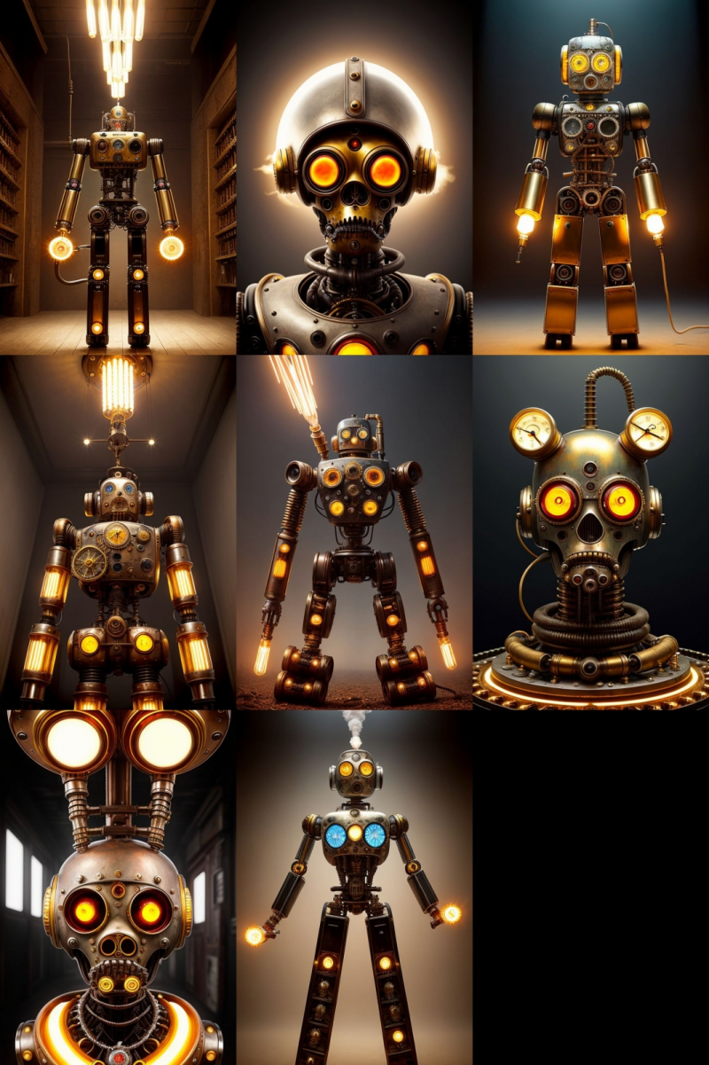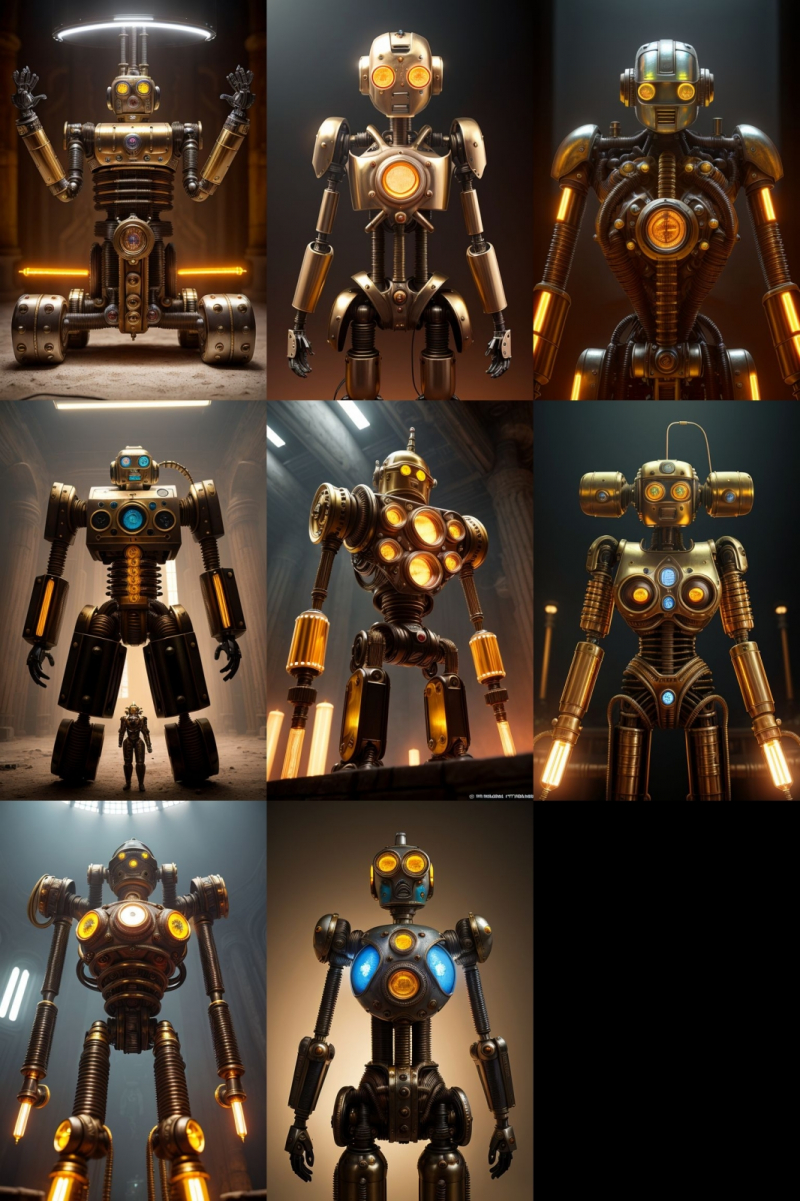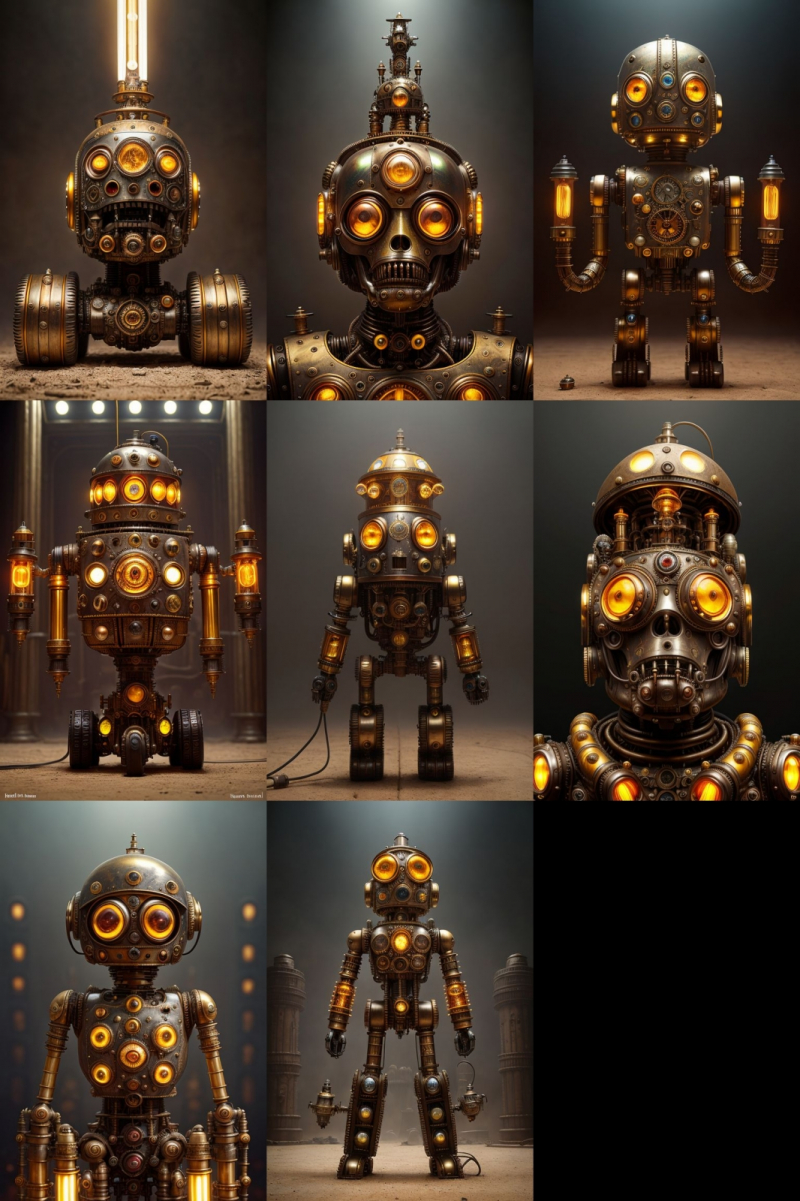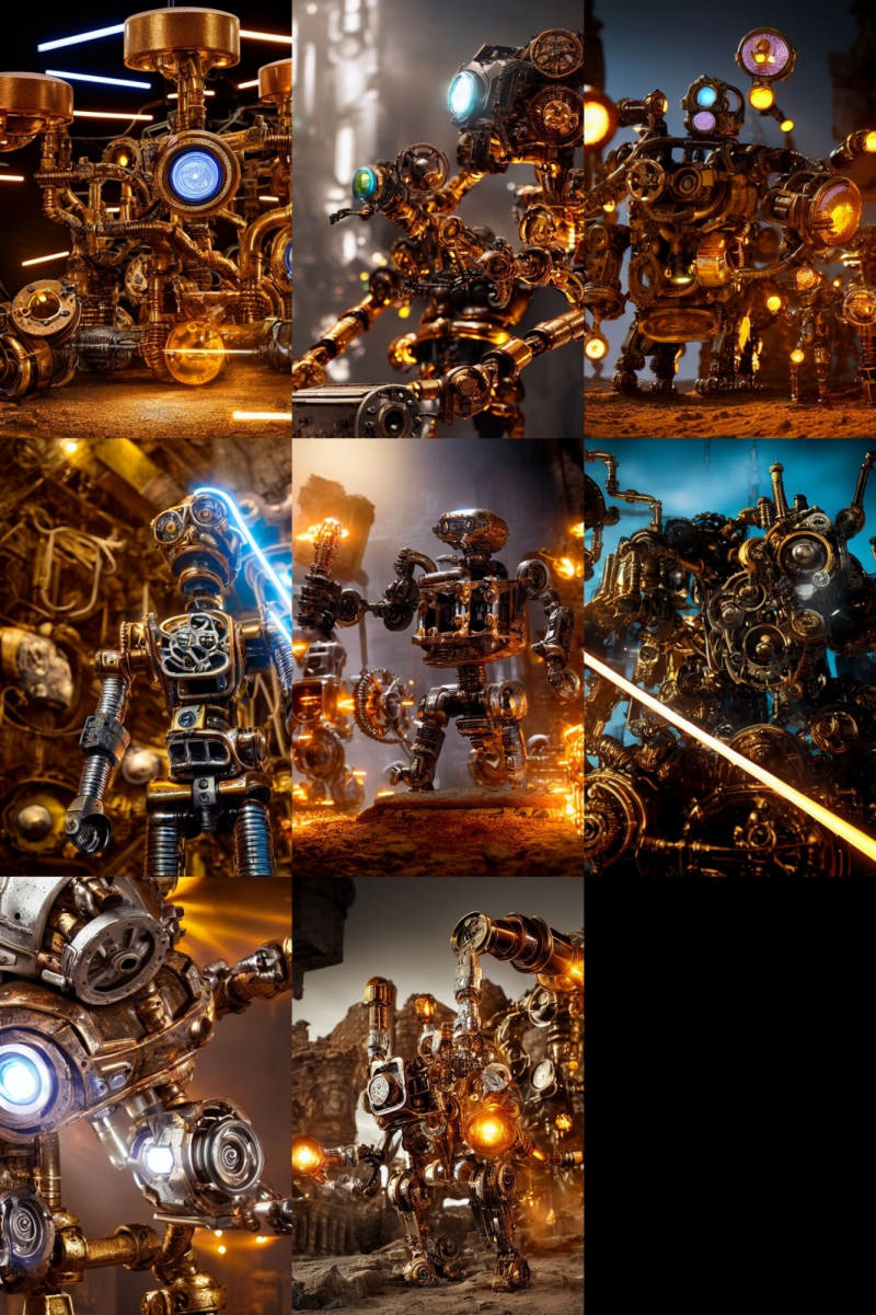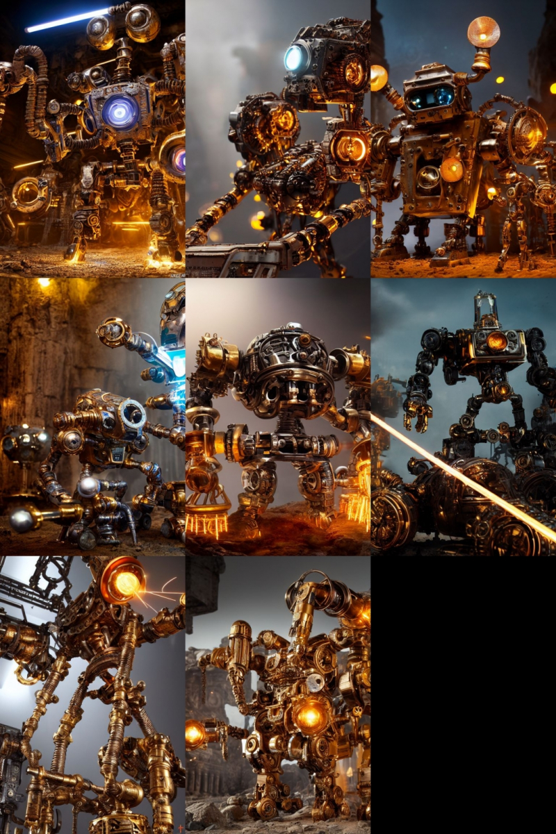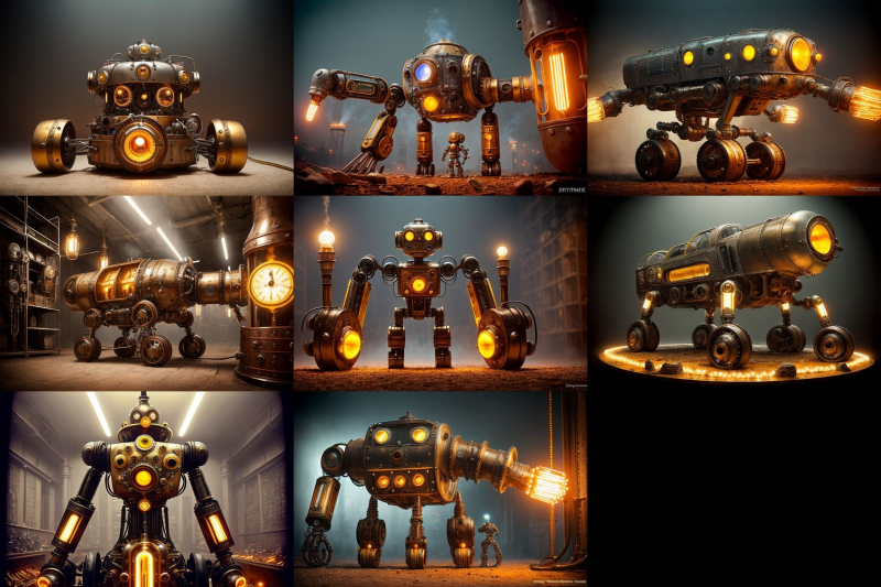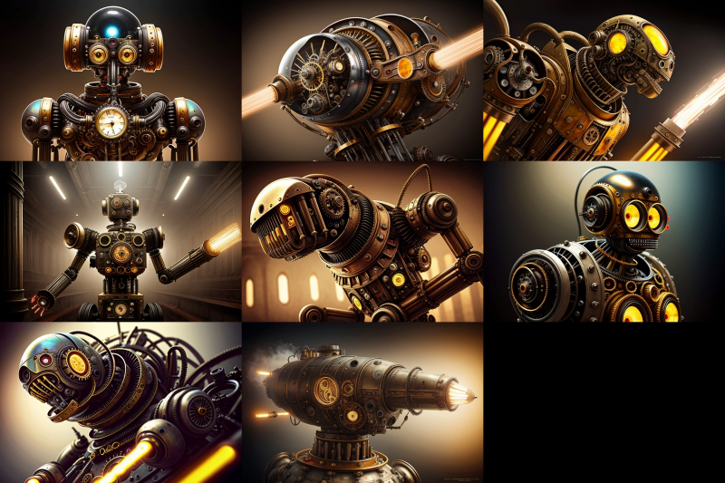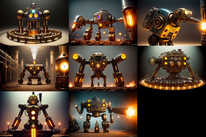 Portanto, na etapa final, ele deve fornecer ao modelo de difusão instruções suficientemente detalhadas na forma de um conjunto de tokens, que tipo de imagem deve ser ocultada no próximo retângulo preenchido com “ruído branco”. cartas de robôs quase steampunk que acabamos de receber ilustram bem.