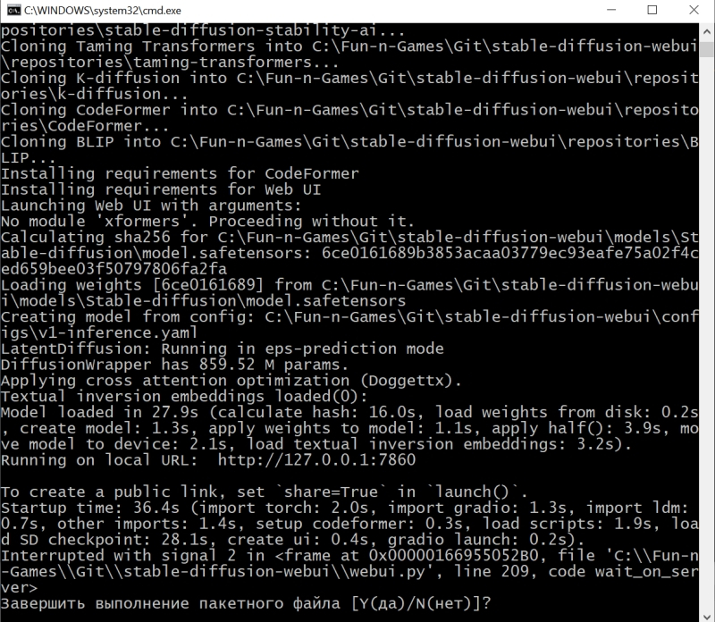 Assim, o modelo Stable Diffusion está instalado e funcionando. Posso começar a desenhar agora? Quase: resta apenas ajustar o desempenho para otimizar o sistema no futuro. Vamos interromper o pacote por enquanto pressionando no terminal ativo (aberto, lembramos, após iniciar o arquivo webui-user.bat do Explorer) as teclas “Ctrl” e “C” simultaneamente e, após o prompt, inserir ” y” com uma confirmação “Enter”. A janela do terminal fechará automaticamente.