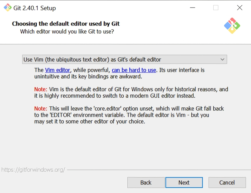 Os programadores Oldfag apreciarão o humor sofisticado dos desenvolvedores da plataforma: na janela “Escolhendo o editor padrão usado pelo Git”, o Vim é selecionado por padrão – um editor de texto conhecido e merecido, mas extremamente controverso; do mundo nem mesmo o Linux, mas o antigo UNIX (mais precisamente, BSD). Sem nos envolvermos em uma discussão sobre os prós e contras de vários editores da era dos terminais de computador exclusivamente de texto, notamos que faz sentido para um usuário distante desses assuntos (especialmente um usuário do Windows) escolher algo menos cheio de ação em nesta janela, pelo menos um bloco de notas banal.