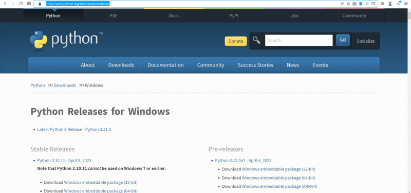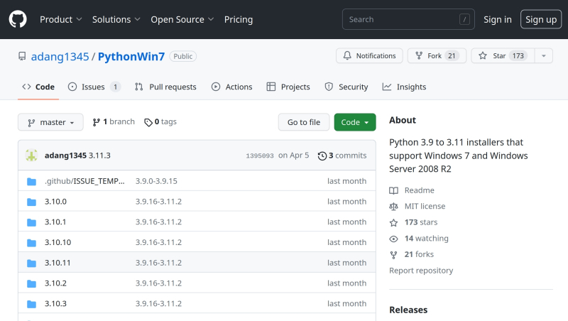Compilações funcionais do Python para Windows 7 estão disponíveis, por exemplo, no GitHub (fonte: captura de tela do github.com)