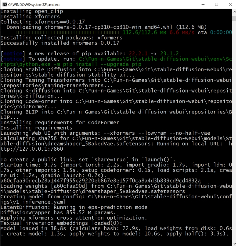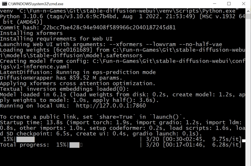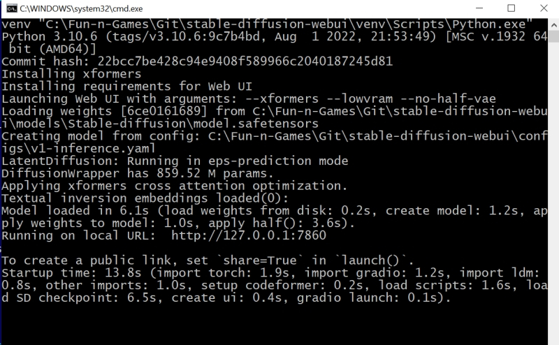 Na verdade, é isso: depois de salvar as alterações no webui-user.bat e fechá-lo, lançamos esse arquivo novamente com um clique duplo – e observamos como o sistema (já com parâmetros otimizados) entra em funcionamento. Depois que a inscrição “Executando no URL local” aparecer, é hora de abrir uma nova guia no navegador e digitar nela o endereço onde a interface da web AUTOMATIC1111 está disponível – http://127.0.0.1:7860 .