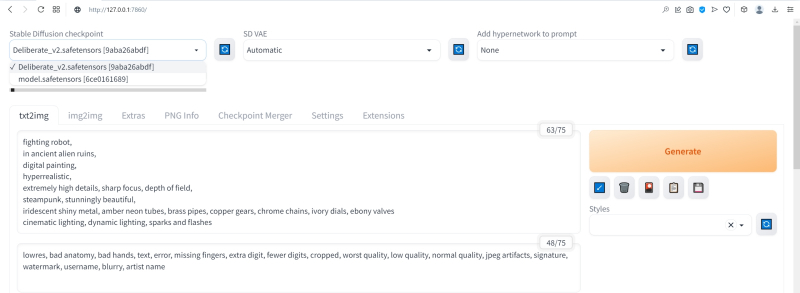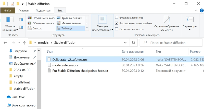Por que se preocupar com os pontos de verificação, mostraremos o exemplo de uma das melhorias mais populares do Stable Diffusion 1.5 hoje chamado Deliberate v.2. É mais lógico baixar este arquivo no formato .safetensors da página deste projeto no já familiar repositório Hugging Face, após o qual precisamos colocar o modelo pré-treinado na mesma pasta onde o modelo base já está localizado – model.safetensors. Desta vez, não há necessidade de renomear nada.