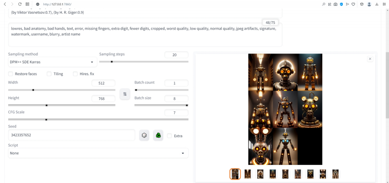 Deixe a dica negativa como está. Você não deve se surpreender com o aparecimento de uma referência a Vasnetsov: a difusão estável foi apresentada ao trabalho de muitos artistas durante o treinamento; portanto, seus nomes na dica de ferramenta afetam o estilo geral da imagem – mesmo que esse próprio artista real não tenha escrito lutando contra robôs em sua prática. A menção ao ArtStation, um conhecido entre mestres e fãs de artes digitais, também não é acidental: as obras populares nele (tendências) em geral têm um estilo muito específico e seu sistema de aprendizado de máquina também captura com bastante sucesso.