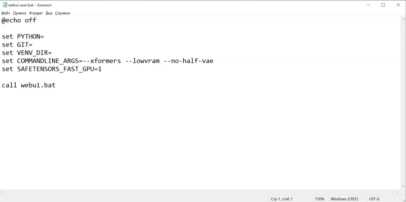 É assim que o webui-user.bat deve ficar após a edição. Argumentos de linha de comando adicionados aqui