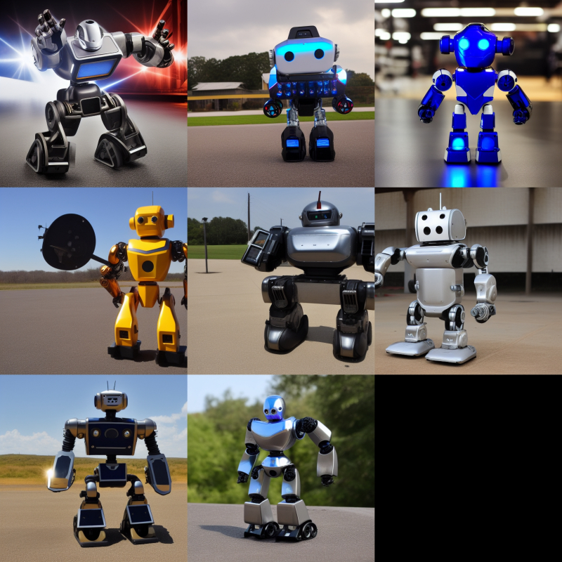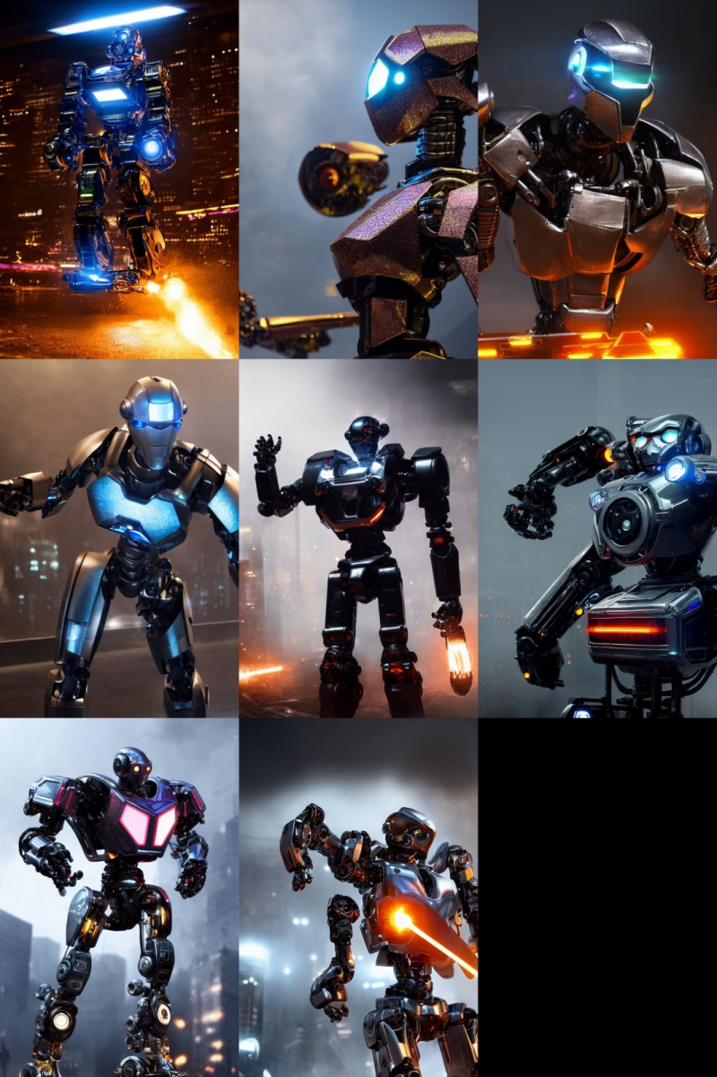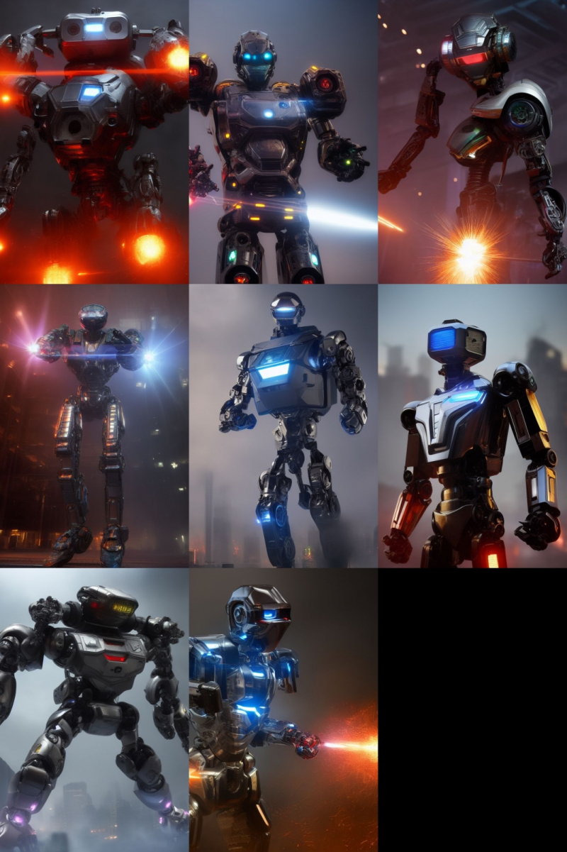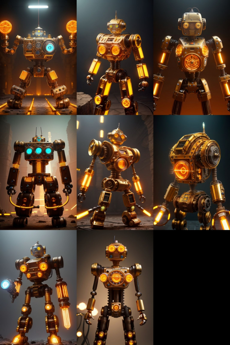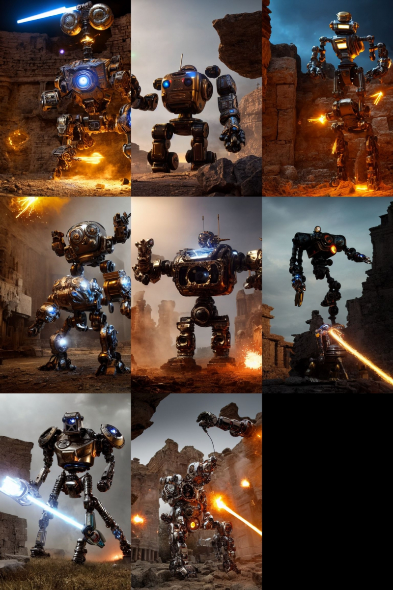 Céu e terra! As figuras dos robôs tornaram-se muito mais estáticas, mas a elaboração e a consistência dos detalhes melhoraram definitivamente. Esta é a força dos checkpoints derivados (do modelo básico): eles permitem, com menos esforço – por parte do usuário final – obter imagens esteticamente mais agradáveis com as mesmas pontas e sementes do que o Stable Diffusion 1.5.
