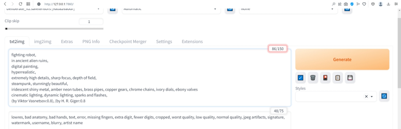 Por padrão, qualquer um deles tem um peso condicional de 1; simplesmente colocar a dica de ferramenta entre parênteses equivale a dar a ela um peso de 1,1 (ou seja, torna-se mais significativo para a geração dessa imagem do que as vizinhas) e, se você quiser definir algum outro peso, é indicado explicitamente após os dois pontos . Pesos menores que 0,5 (devido à influência insignificante de tais dicas na imagem final) e mais de 1,5 (o resultado pode ser graficamente imprevisível) geralmente devem ser evitados, mas, em qualquer caso, esse é outro grau de liberdade da inteligência artificial. criatividade mediada – que os entusiastas gostam de bom grado. Ao definir os estilos de ambos os artistas para pesos baixos, evitaremos sua influência excessiva na imagem final (um Alien robótico em um vestido de verão certamente não aparecerá aqui),